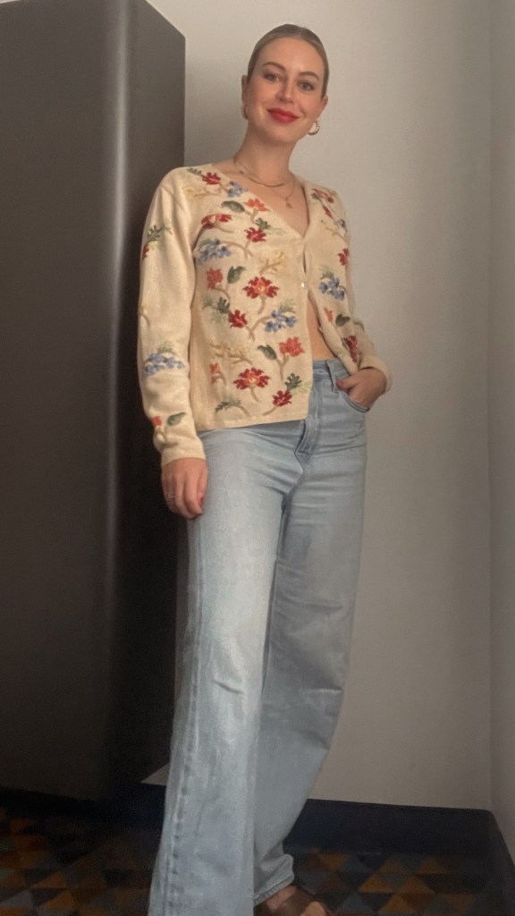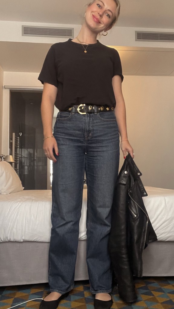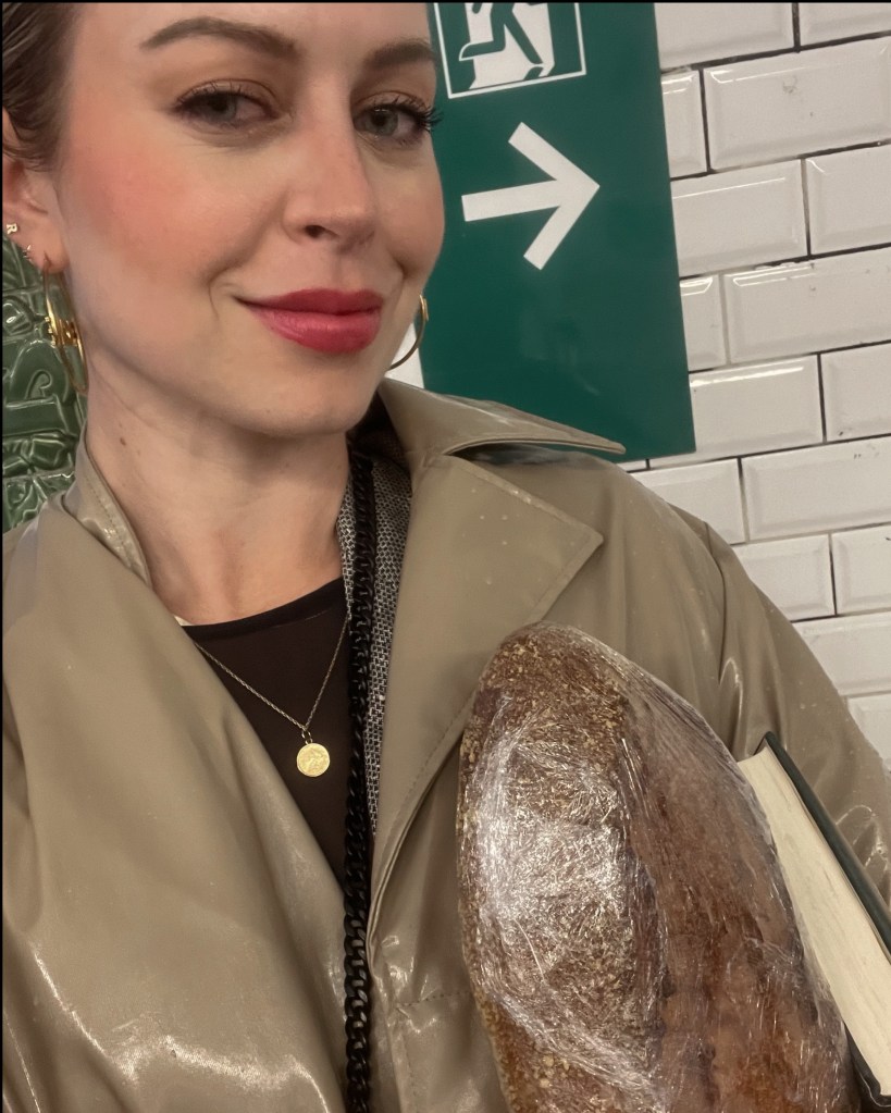 Same Old Navy dark wash jeans, a secondhand Brooks Brothers black leather belt, and the tried-and-true-by-that-point Rothy’s – accessorized with a book and a loaf of bread.