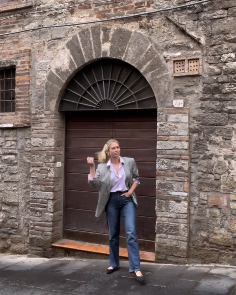 Let’s travel in time and space to Todi, Italy. We’ll bring the same blazer, these jeans from Old Navy ($22.49), a pink men’s button-down from Goodwill ($7.99) and my new – but beloved – Rothy’s.